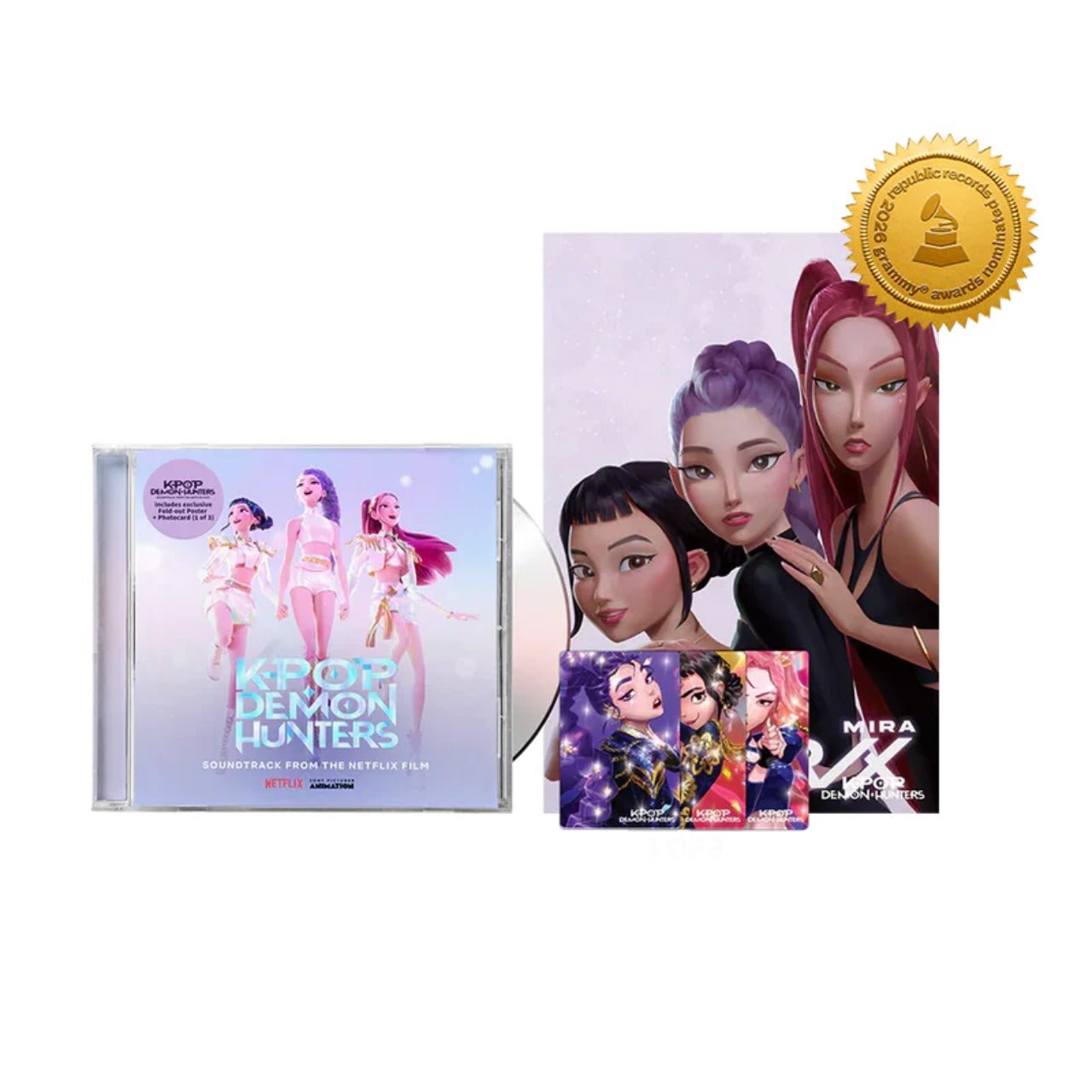 Q: Is the CD the same tracklist as the vinyl? A: Yes! Both the CD and vinyl contain the same 12 tracks from the K-Pop Demon Hunters soundtrack.