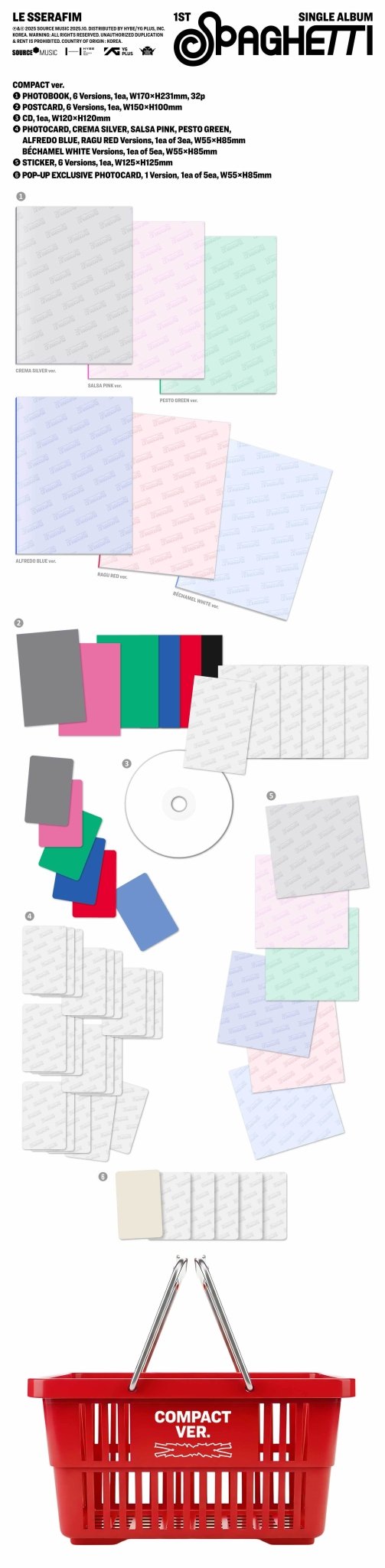 CARATs aren’t the only ones eating good this fall — FEARNOTs, dinner is served! 🍝 LE SSERAFIM are dropping their first single album “Spaghetti” in six Compact flavors: Crema Silver, Salsa Pink, Pesto Green, Alfredo Blue, Ragu Red, and Béchamel White. Each one comes loaded with exclusives, but this version packs the extra spicy POP-UP Exclusive Photocard (yes, only available here 👀).