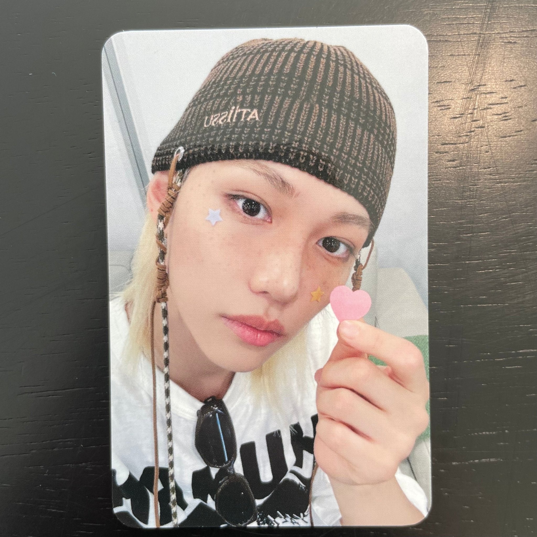 A: It’s an official, rare pre-order benefit photocard from Soundwave, released during Stray Kids’ 4th full album KARMA era. Members are holding a tiny pink heart sticker, making this POB instantly iconic.